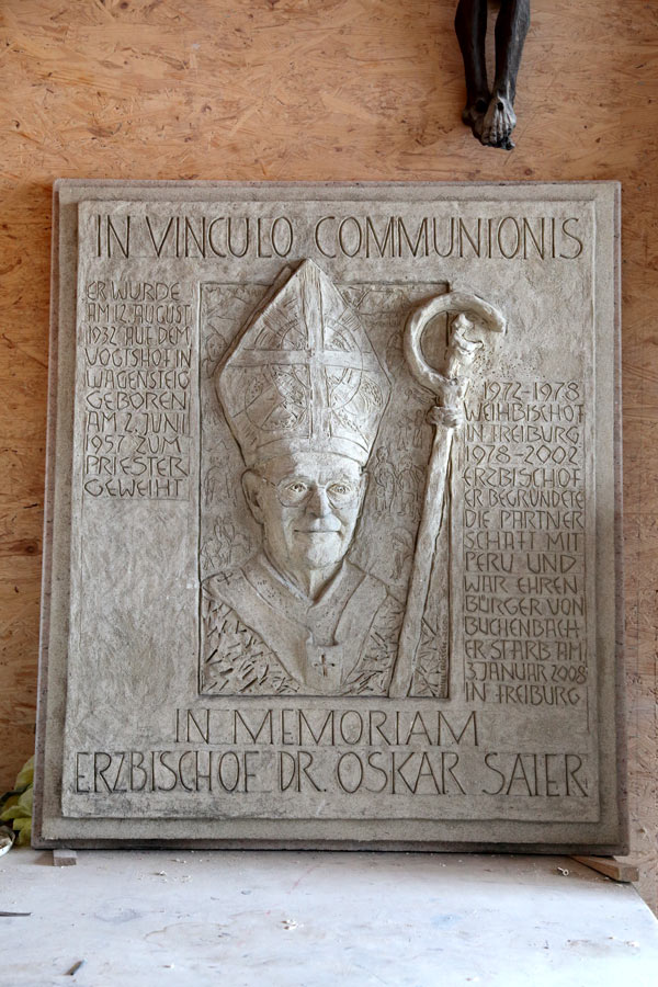 Pfarrkirche Buchenbach: Gedenktafel mit Portraitrelief von Erzbischof Dr. Oskar Saier 1932-2008, der vom Vogtshof in Buchenbach Ortsteil Wagensteig stammte.
